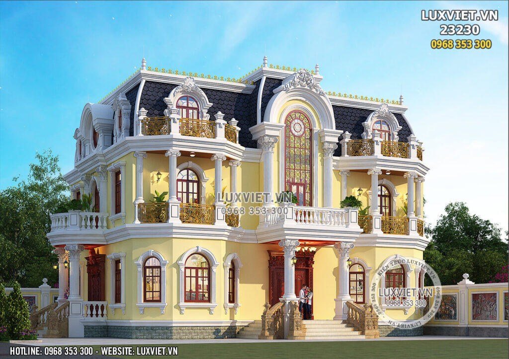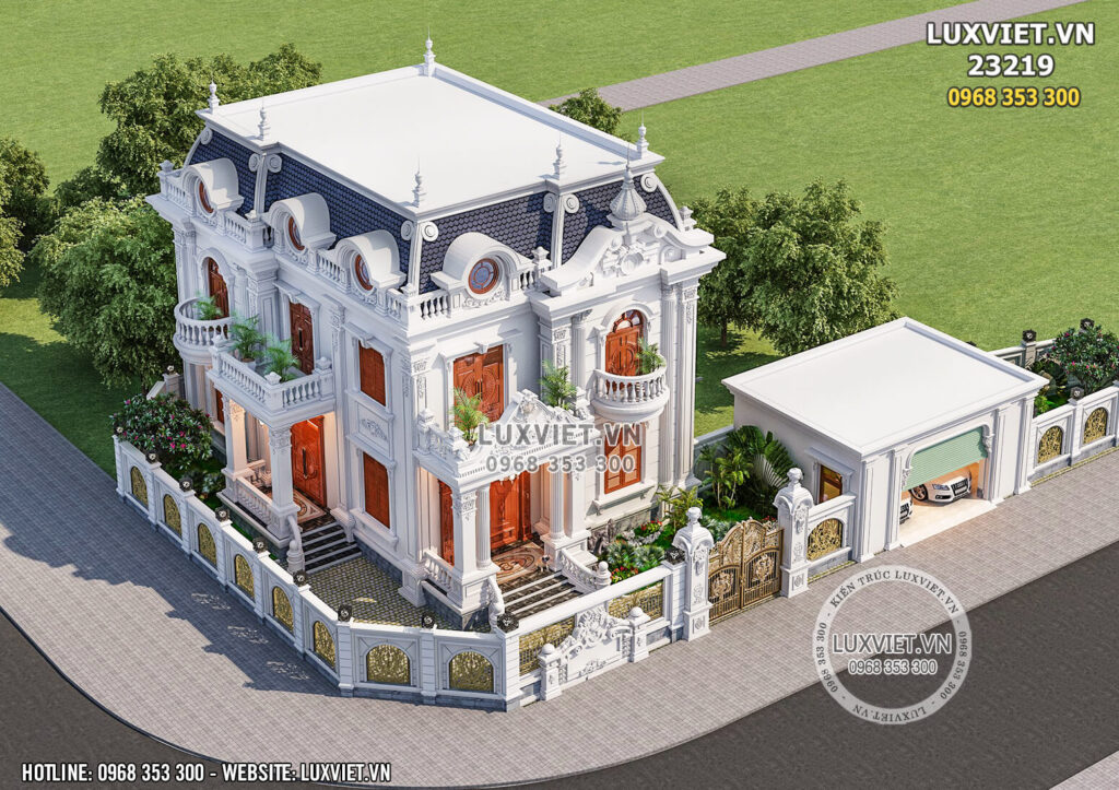 .Biệt thự lâu đài 3 tầng cổ điển được xây dựng trên một khu đất khang trang rộng lớn, nơi tâm điểm của mọi ánh nhìn để có thể khoe hết vẻ đẹp cầu kì mĩ miều của toàn bộ ngôi nhà. Toàn bộ lâu đài mang một màu trắng tinh tế làm hài lòng bất kì ai khó tính nhất, hệ thống tiền sảnh được đậm tô màu vàng quý tộc, lâu đài còn được làm đẹp bởi hệ thống mái mansard, mái vòm nhấp nhô mang lại linh hồn cho toàn bộ lâu đài. Lâu đài còn ấn tượng hơn bởi hệ thống cổng kiên cố, uy nghi, nửa mở nhằm có thể khoe nhà đẹp với bất cứ ai. Khi nhìn vào lâu đài dinh thự, chắc hẳn ai cũng muốn có cho mình một biệt thự lâu đài pháp như vậy.